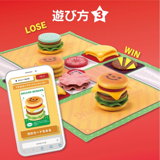 3.できるかな?デラックスニコバーガー指示通りに具材たっぷりのバーガータワーを作りましょう。一番早く正解のバーガーを作ることができた人が勝ちです!