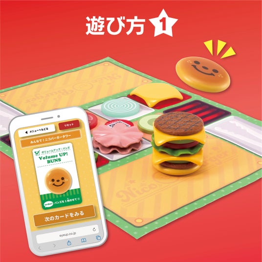 1.みんなで!ニコバーガータワースマートフォンに表示されたオーダー通り、ピースを載せていきます。ニコバーガーをできるだけ高く作ってみましょう!