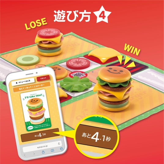 4.覚えて!作って!ニコバーガー表示されたオーダーを5秒間覚えて、カードが裏返しになったら、記憶を頼りにバーガーを作りましょう。オーダー通り正しく作れた人の勝ちです!