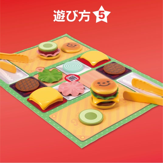 5つの遊び方で楽しめる、ボリューム満点の絶品バーガーが誕生しました!スマートフォンやタブレットと連動した4つのゲームや、バーガーショップごっこで楽しめます。※こちらの商品は食べられません。