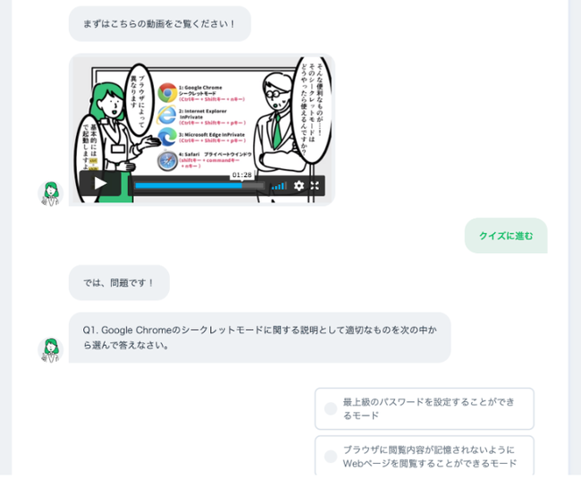 DX人材育成に必要な知識やテクニックをマンガ動画とクイズを用いてチャット形式で楽しく学習していただけます。