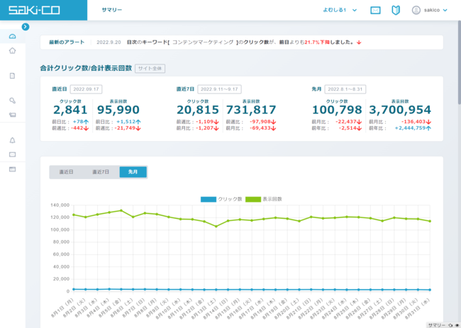 『saki-co(さきこ)』は、Google Search Consoleの自動集計ツールです。日次、週次、月次のクリック数や順位などの数値と、比較データを簡単にチェックすることができます。