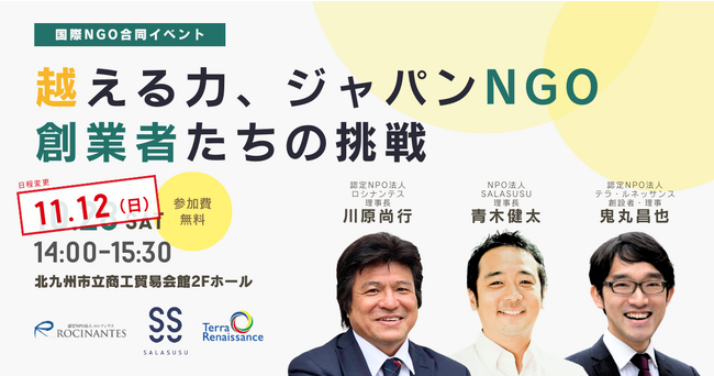 認定NPO法人ロシナンテス(福岡県北九州市、 理事長:川原尚行)は、NPO法人SALASUSU、認定NPO法人テラ・ルネッサンスと共催する「 越える力、ジャパンNGO創業者たちの挑戦」の日程を、2023年10月28日から11月12日に変更することをご案内いたします。