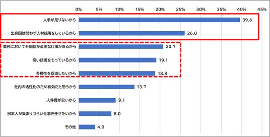 ●外国人を活用する理由は、「人手が足りない」が1位(39.6%)。「出身国は問わず人材採用をしている(26.0%)」 職場も多く、全体的に「人手不足」を感じられる結果となった。