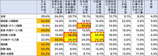 ・業種別にみると、「外国語が必要な仕事があるから」という理由が「卸売業・小売業」では36.0%、と「その他サービス業」では29.0%と、1位に。また、「製造業・オフィス勤務」では、「高い技術をもっているから」という理由が30.0%で、1位となった。人手不足だけではなく、外国人だからこそ採用したいという理由も高くなっている。