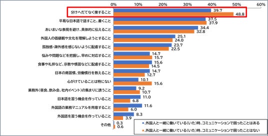 ・外国人と一緒に働いている(いた)時、コミュニケーションで困ったことが「ある」人と、「ない」人で比較したところ、「ない」と答えた人の方が、「分けへだてなく接すること」が9.1ポイント高く、積極的にコミュニケーションを取ろうと努力していることがわかった。