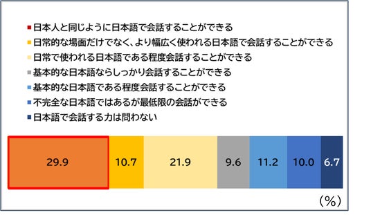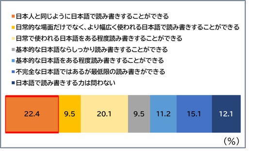 ・「会話」については「日本人と同じように日本語で会話することができる(29.9%)」が最も高くなった。「読み書き」についても同じく「日本人と同じように日本語で読み書きすることができる(22.4%)」と最も高くなったが、「会話」に比べて7.5ポイント低い結果に。さらに「日本語で読み書きする力は問わない」と答えた人が12.1%となった。