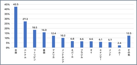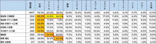 ・業種別にみると、「製造業・工場勤務」でベトナム・フィリピンが中国に続いて多く、「建設業」ではベトナムが1位(44.5%)、「医療・福祉」ではフィリピンが1位(35.5%)となっている。