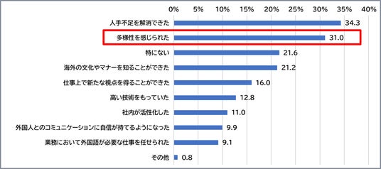 ・一般社員クラスの人には、「外国人と一緒に働いて良かった点」について聞いたところ、「人手不足を解消できた(34.3%)」が1位となったが、2位が「多様性を感じられた(31.0%)」となった。