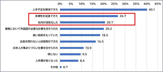 ・管理職クラスの人に「外国人を雇用して良かった点」について聞いたところ、「人手不足を解消できた(40.1%)」が1位となったが、2位が「多様性を促進できた(26.7%)」、3位が「社内が活性化した(20.7%)」となった。