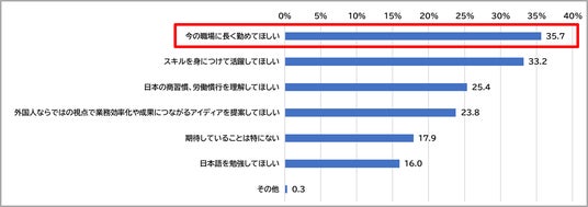 ●一緒に働いている外国人に仕事上で期待していることの1位は、「今の職場に長く勤めてほしい(35.7%)」