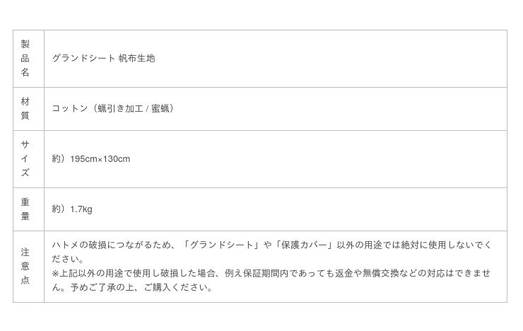 ※「グランドシート(200cm×110cm)」、「グランドシート 帆布生地」のどちらも対象です