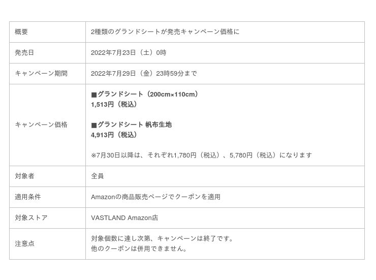 2種類のグランドシートは、7月22日(金)の夕方ごろにAmazonに出品します。ですが、クーポンの発行は7月23日(土)0時です。