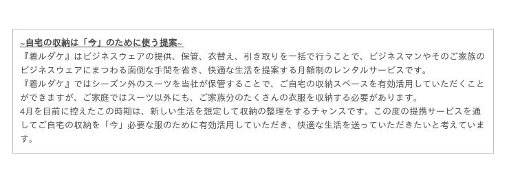 株式会社レナウン(東京都江東区有明/代表取締役社長 神保佳幸)の月額制トータルサポートサービス『着ルダケ』は、寺田倉庫株式会社(東京都品川区東品川/代表取締役 寺田航平)が運営する、誰もが箱単位で倉庫を持てるサービス「minikura(ミニクラ)」とサービス提携をします。3月2日より『着ルダケ』会員がマイページを経由してminikuraに登録した際に、minikuraのサービス内で使用できるminikuraポイントを1000ポイントプレゼントします。『着ルダケ』は今後、このような「生活を快適にする」という同じ目的をもったサービスとの連携を強化し、会員に向けて様々なサービスを提供していきます。