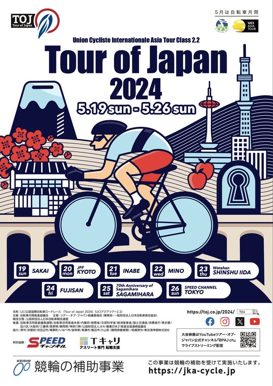 ツアー・オブ・ジャパン組織委員会(事務局:一般財団法人日本自転車普及協会)は、ツアー・オブ・ジャパン(以下TOJ)の2024年開催についてお知らせいたします。「Tour of Japan 2024」は、日本最大級の国際自転車連合(UCI)公認の国内唯一の都府県を跨ぐステージレースです。TOJは、出場チームや選手の多様化を進め、この国を元気にする美しい旅のレベルアップにチャレンジします。TOJは40年以上の歴史を持ち、日本の代表的都市である大阪と東京をつなぐアジアでも有数の自転車レースとして発展してきました。今回の開催により、TOJの存在感は更に増すことでしょう。TOJは若いサイクリストが活躍した後にトッププロとなり、ツール・ド・フランスでも輝く活躍をしています。また、若手の登竜門的なレースとして多くの原石を磨く機会も提供しています。