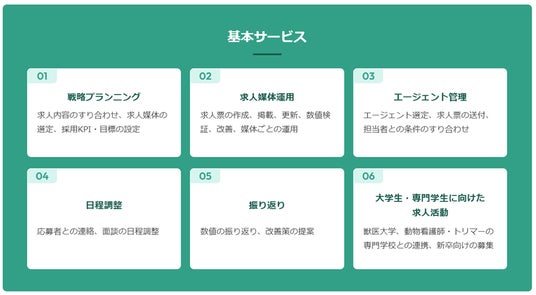 「採用の負担をゼロに!」をモットーに、動物病院の採用業務を代行するサービスです。