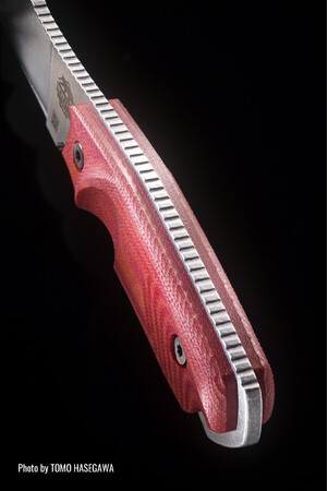 柔らかいものを切る事と、硬いものを削ったり割ったりする二刀流の性能を一本のナイフにて実現する事を目的に設計しました。