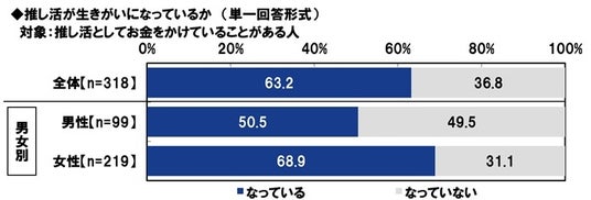 男女別にみると、推し活が生きがいとなっている人の割合は、女性では68.9%と、男性(50.5%)と比べて18.4ポイント高くなりました。