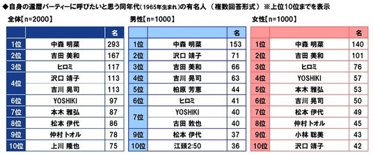 また、自身の還暦パーティーに呼びたいと思う同年代の有名人を聞いたところ、自身が影響を受けたと思う同年代の有名人と同様に「中森 明菜さん」が1位となり、「中森 明菜さん」が2冠となりました。続く2位は「吉田 美和さん」、3位は「ヒロミさん」でした。