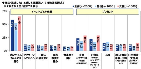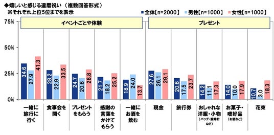 男女別にみると、イベントごとや体験では男女ともに1位は「一緒に旅行に行く」(男性27.9%、女性41.3%)となり、男性では2位「一緒にお酒を飲む」(24.0%)、3位「食事会を開く」(22.9%)、女性では2位「食事会を開く」(33.5%)、3位「プレゼントをもらう」(28.8%)となりました。