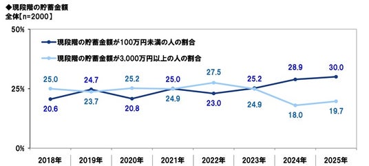 今年の還暦人の現段階の貯蓄額をみると、「100万円未満」が30.0%と調査開始以来最も高い水準に達した一方、「3,000万円以上」は2024年18.0%、2025年19.7%と2年連続で20%未満にとどまりました。
