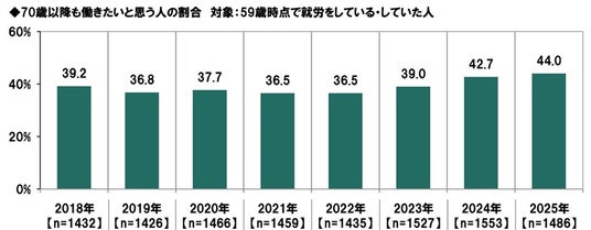 過去の調査結果と比較すると、70歳以降も働きたいと思う人の割合は、2022年36.5%→2023年39.0%→2024年42.7%→2025年44.0%と、2022年以降の上昇傾向が引き続きみられ、調査開始以来最も高い水準となりました。