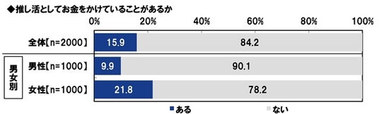 まず、全回答者(2,000名)に、推し活としてお金をかけていることがあるかを聞いたところ、「ある」は15.9%、「ない」は84.2%となりました。