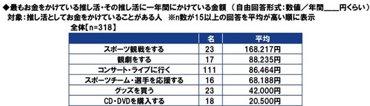 推し活としてお金をかけていることがある人(318名)に、最もお金をかけている推し活の内容と、その推し活に一年間にかけている金額を聞いたところ、かけている金額の平均は、「スポーツ観戦をする」が168,217円で最も高くなり、大相撲観戦に1,500,000円かけているといった回答もみられました。次いで「観劇をする」が88,235円、「コンサート・ライブに行く」が86,464円、「スポーツチーム・選手を応援する」が68,188円、「グッズを買う」が42,000円、「CD・DVDを購入する」が20,500円となりました。
