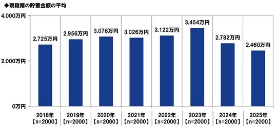 過去の調査結果と比較すると、貯蓄金額の平均は、2023年以降の減少傾向が続き、2023年3,454万円→2024年2,782万円→2025年2,460万円と、2024年の調査から322万円の減少がみられ、2025年は調査開始以来の最低額となりました。