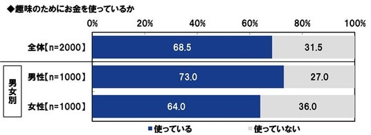 男女別にみると、趣味のためにお金を使っている人の割合は、男性では73.0%と、女性(64.0%)と比べて9.0ポイント高くなりました。