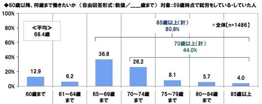 また、60歳以降、何歳まで働きたいかについてみると、65歳以降も働きたいと思う人(65歳以降の年齢を回答した人)の割合は80.8%、70歳以降も働きたいと思う人(70歳以降の年齢を回答した人)の割合は44.0%でした。