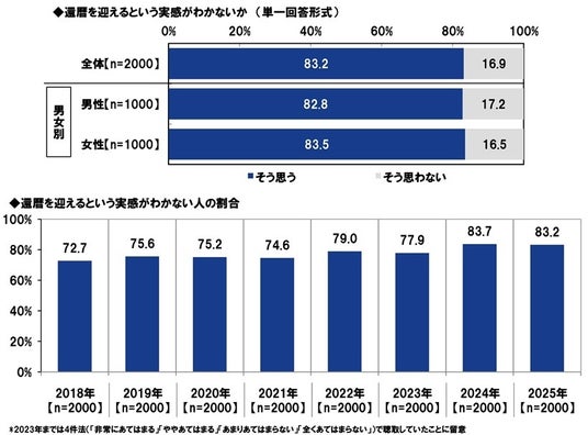 過去の調査結果と比較すると、還暦を迎えるという実感がわかない人の割合は、2018年の初回調査から、2024年の調査まで緩やかな上昇傾向にありましたが、今回調査では前回と同水準となりました。