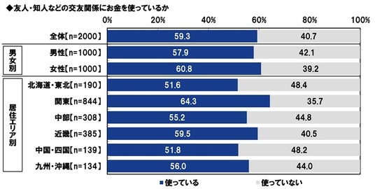 居住エリア別にみると、友人・知人などの交友関係にお金を使っている人の割合は、関東(64.3%)で最も高くなりました。