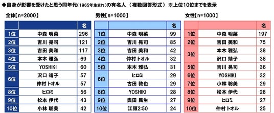 次に、自身が影響を受けたと思う同年代の有名人を聞いたところ、今年、自身初のトリビュートアルバムを発売した「中森 明菜さん」が1位となりました。以降、2位「吉川 晃司さん」、3位「吉田 美和さん」、4位「本木 雅弘さん」、5位「YOSHIKIさん」が続きました。