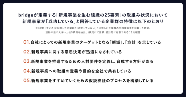 ・bridgeが定義する「新規事業を生む組織の25要素(※)」の取組み状況において、新規事業が「成功している」と回答している企業群の特徴は以下のとおり。