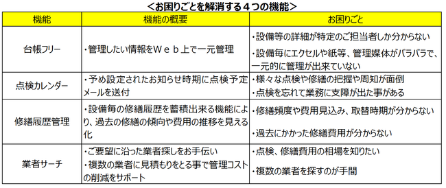 「手間をかけずに、効率的に自社の施設や設備を適切に管理したい」というお客さまのお声をもとに「施設管理のミカタ」を開発いたしました。『台帳フリー』『点検カレンダー』『修繕履歴管理』『業者サーチ』の4つの機能で、皆さまのお困りごとを解消いたします。