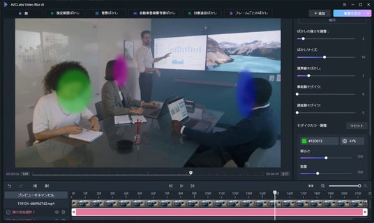AIが動画内の顔や物体を自動検出し、オペレーターは一覧から対象をクリックして選び、ぼかし・消しの方法を指定するだけで処理できます。映像編集の専門知識がないアシスタントでも、短時間で実務に投入できる操作性を目指して設計されています。