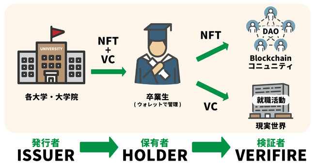 本NFT証明書は、NFTとVCを連動させることで学生のプライバシーに配慮したつくりとなっているのが特徴です。
