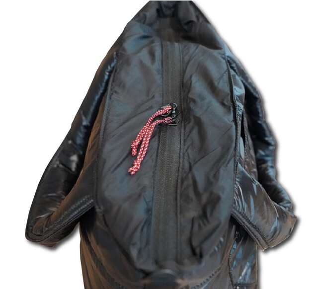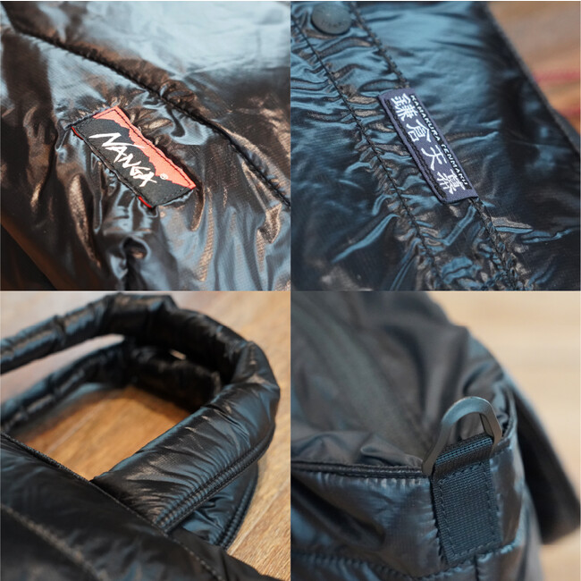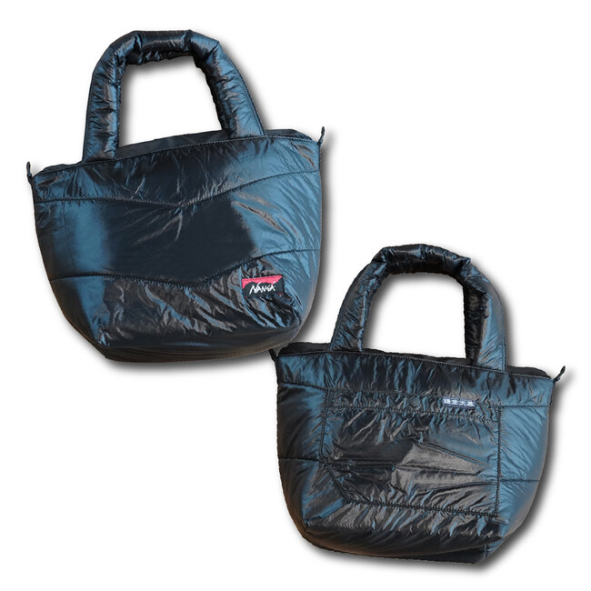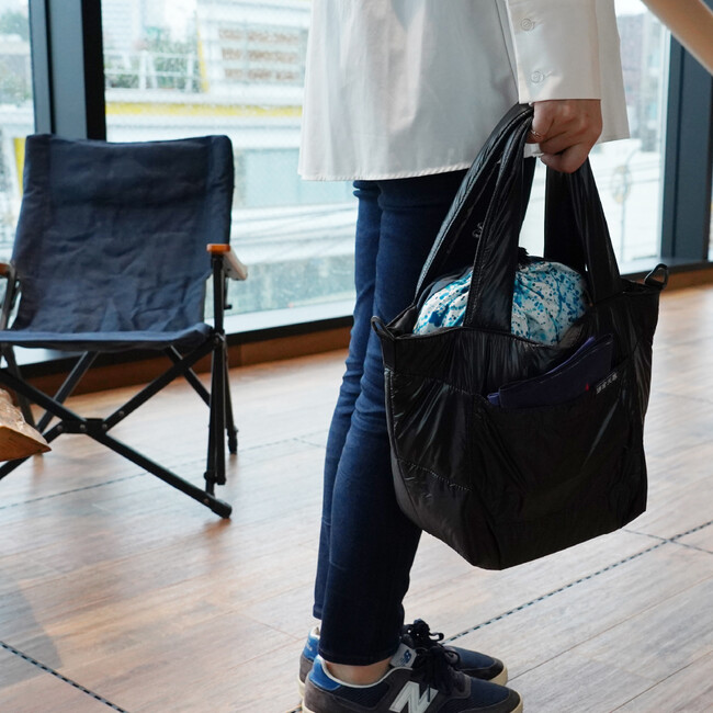 表生地に10デニールのリサイクルリップナイロン、中綿にはリサイクルポリエステルを使ったエコな日本製のトートバッグ。