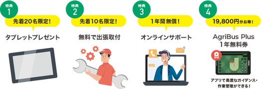 株式会社農業情報設計社(北海道帯広市、代表取締役 濱田安之、以下「当社」)は、農業者の皆様がより気軽にスマート農業を導入できるよう、新たなキャンペーンを発表しました。2024年2月6日(火)から2024年3月31日(日)までの期間中、「AgriBus自動操舵パッケージ」をご購入のお客様に、新たな特典を提供します。