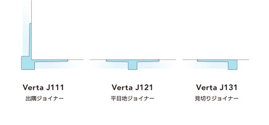 『Verta J1』は、出隅ジョイナー『J111』、平目地ジョイナー『J121』、見切りジョイナー『J131』の3タイプをラインナップ。不燃化粧板だけでなく、化粧合板(3mm)や左官仕上げ、あるいはクロスとの見切りとしても使用できる。