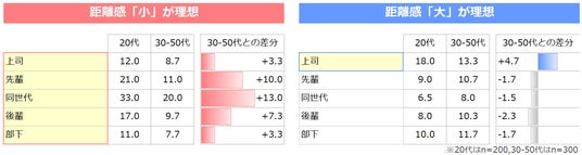 「距離感小」または「距離感大」を求める上司のイメージ差を、世代間で比較しています。