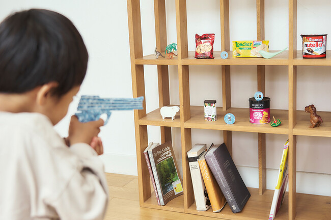 的として、おもちゃやお菓子の箱なども一緒に並べれば、お祭りの射的屋さんごっこもできます。