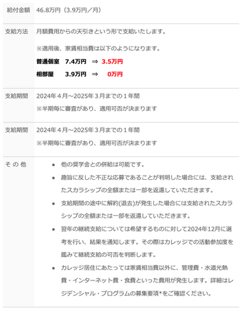 合格者は月額費用に対して最大3.9万円/月のスカラシップを受けることができ、相部屋の場合には家賃相当額0円(個室の場合は差額の負担)にてSHIMOKITA COLLEGEに居住することができる。