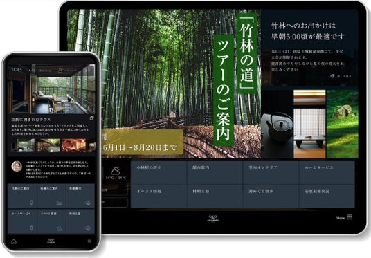 主な特徴として、地域・観光情報の発信、浴室利用状況を確認できる館内DXを促進するインフォメーション機能を備える他、宿泊施設の空いたスペースを“ショールーム”として有効活用することで、地域の逸品に五感を通して触れていただける、「体験Eコマース」のサービスを提供しています。