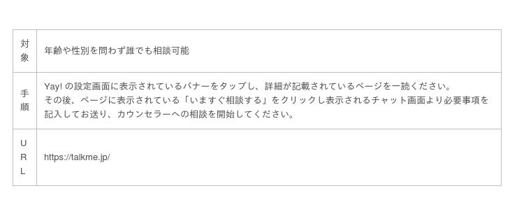株式会社ナナメウエ(本社:東京都港区、代表:石濱 嵩博)は特定非営利活動法人あなたのいばしょ(東京都 理事長 大空 幸星)が運営するあなたのいばしょチャット相談と連携し、開発・運営する同世代が好きなことでつながる音声通話アプリYay!(イェイ)にて24時間受付、年齢や性別を問わず誰でも無料で個人の悩みやDV、虐待における相談などができる窓口へのリンクを設置いたしました。