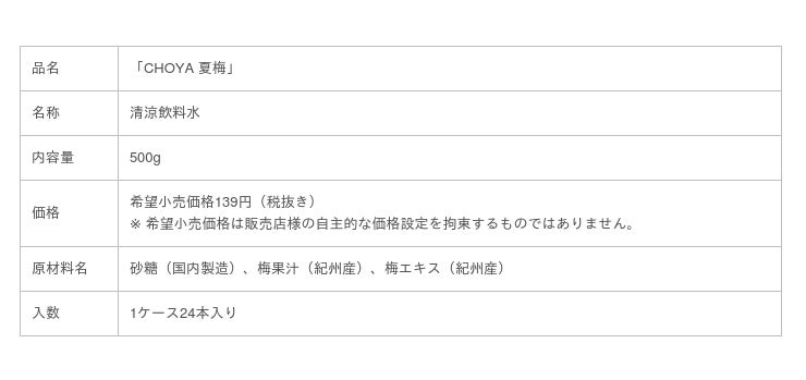 「CHOYA 夏梅」は砂糖でじっくりエキスを抽出した梅果汁と酸味が際立つ梅エキスを使用し、フルーティーな香りとまろやかな酸味の、口あたりすっきりとした夏にぴったりの味わいです。