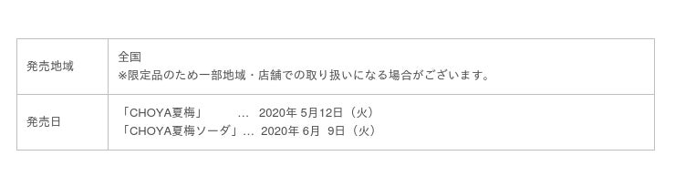 チョーヤ梅酒株式会社(本社:大阪府羽曳野市、社長:金銅重弘、以下チョーヤ)は、梅果汁入り清涼飲料「CHOYA 夏梅(なつうめ)」を2020年5月12日(火)、スパークリングタイプの「CHOYA 夏梅(なつうめ)ソーダ」を2020年6月9日(火)から数量限定で全国発売いたします。