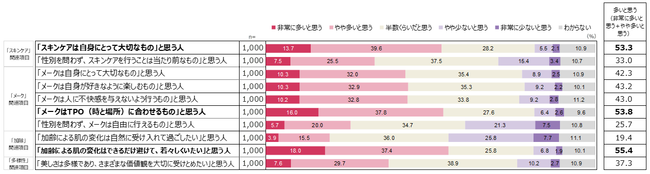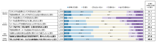 男女ともに「メークはTPOに合わせるもの」「美しさは多様であり、さまざまな価値観を大切に受けとめたい」が上位