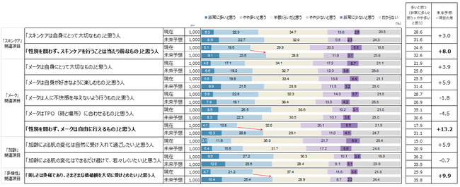 未来予想では、「化粧は性別を問わないと思う人、美しさは多様でさまざまな価値観を大切にしたい人が増える」と予想